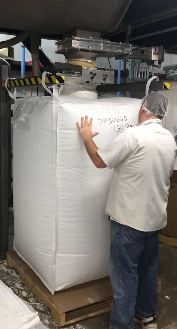 The picture to the right shows a spout top bag being loaded with flour. The downspout has a bladder which expands to create an airtight connection between the spout and the downspout, so no dust is allowed to escape during the load.